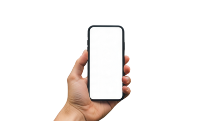 Hand holding smartphone with white screen in front of blurred mountain cabin Isolated on Transparent Background