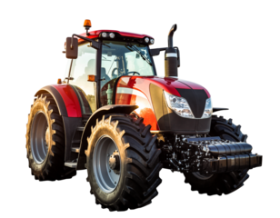 A red tractor with large tires and a glass enclosed cabin on a black background