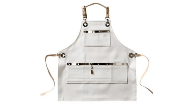 A triple-stitched utility apron with metal clips, white background --ar 16:9