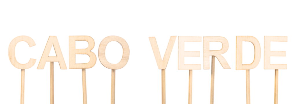 Decoration of hand-cut wooden letters spelling Cabo Verde. Cape Verde sign.