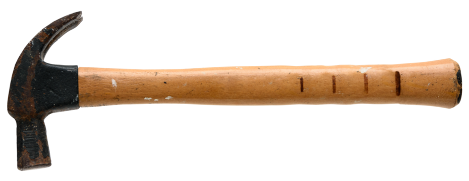 Martelo velho com cabo de madeira.  Martelo com marcas de uso e respingo de tinta.