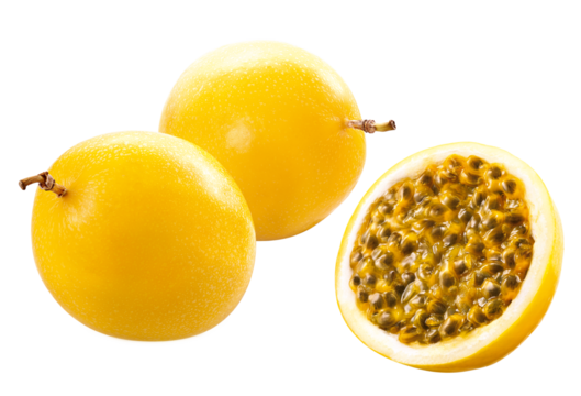 composição com maracujás inteiros e maracujá cortado isolado em fundo transparente