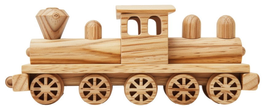 Wooden toy train with detailed wheels and caboose, cut out - stock png.