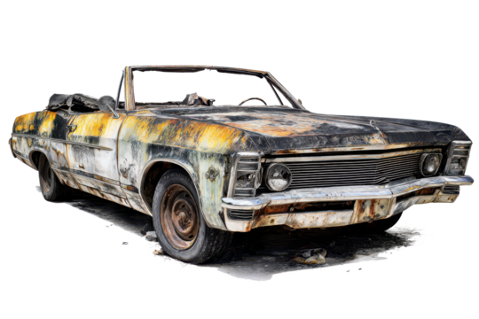 Artistic watercolor painting of a weathered and rusty classic american convertible car
