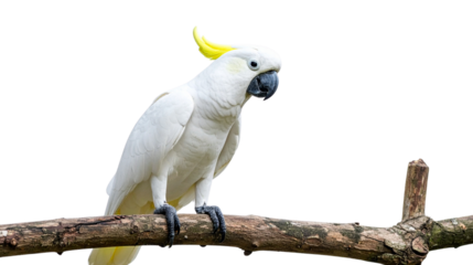 Yellow-crested cockatoo (Cacatua sulphurea) perched on a tree branch isolated clipping path