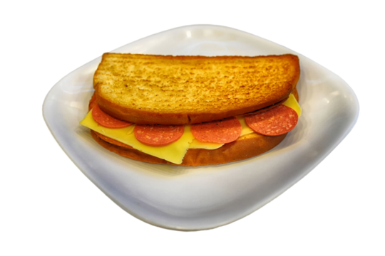 A traditional Turkish pastrami sandwich, isolated on a transparent background, with thinly sliced ​​beef, melted kashar cheese, and pickles on a crunchy fresh baguette. high resolution PNG file