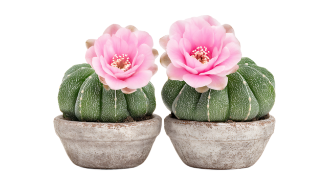 Two Pink Flowering Cacti In Gray Pots On Transparent Background