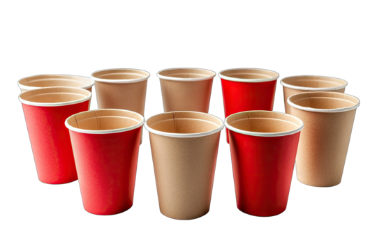 A Group Of Disposable Paper Cups In Red And Brown Colors Arranged In A Circle On A Transparent Background