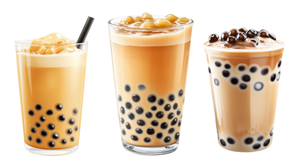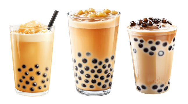 Creamy bubble milk tea with tapioca pearls in glass cup, isolated on white transparent background