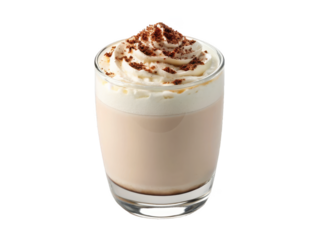 Creamy, frothy caramel macchiato in a clear glass presents a layered beverage with rich coffee and vanilla flavors, topped with a generous swirl of whipped cream, isolated on transparent background.