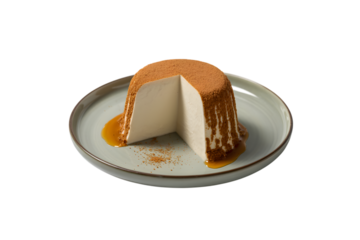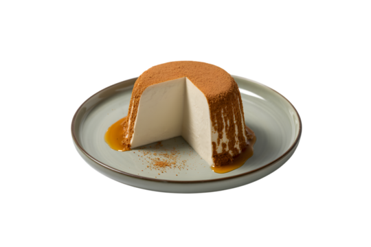 delicious tiramisu dessert on a plate, cut open . Isolated on transparent background, png