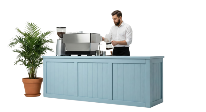 modern man preparing coffee at stylish blue counter with large plant isolated transparent background