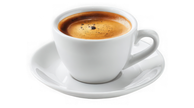 Dark blue coffee cup with espresso isolated PNG, hot drink in a mug on transparent background for cafe and restaurant use