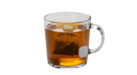 A glass mug holds amber tea with a tea bag, isolated on black. Perfect for product staging, ads, posters.
