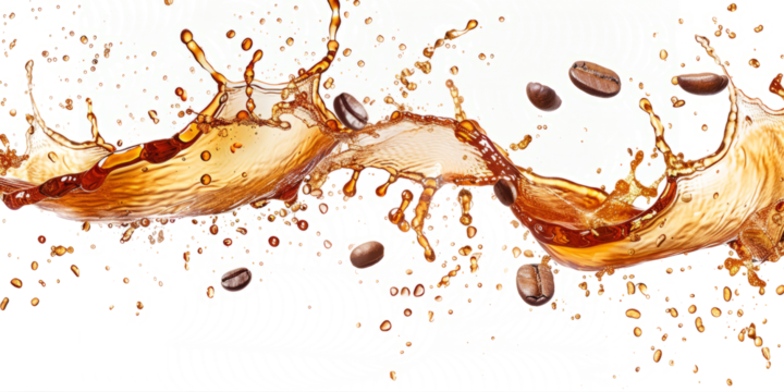 coffee splash with flying beans, capturing the energy on a white backdrop.