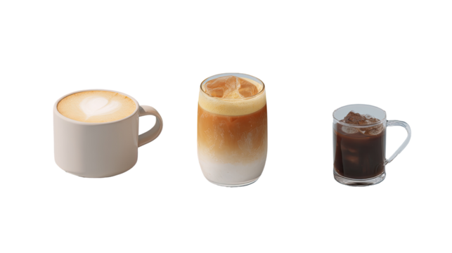 Photo of a variety of iced coffee drinks with cream and chocolate isolated on transparent background
