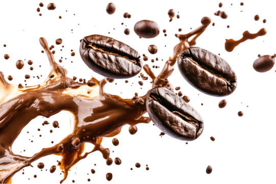 Coffee beans exploding in a splash of rich brown liquid an aromatic delight