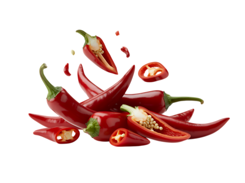 Spicy Red Chili Pepper: A vibrant red chili pepper with a glossy sheen, captured in a close-up shot that highlights its fiery color and delicate stem.