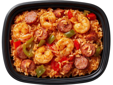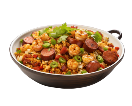 Delicious shrimp jambalaya with sausage and rice bowl on transparent background