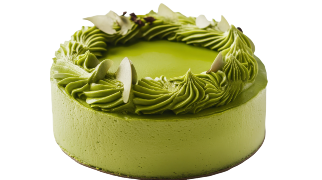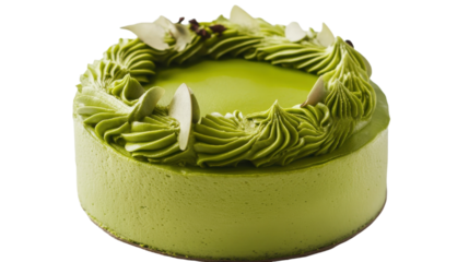 A delightful green matcha cake adorned with elegant frosting and fresh fruits, on the transparent background. PNG Format