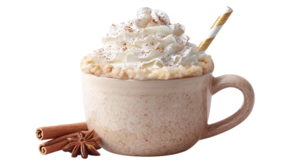 tea in a white ceramic cup with a chocolate croissant on a transparent background