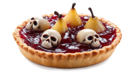 Halloween food. Homemade pie with jam and scary skull-shaped pears