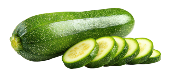 One whole green zucchini with several slices on a black background