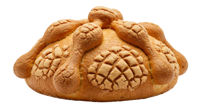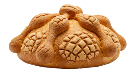 A close up shot of pan de muerto bread with bone shaped decorations on a black background on transparent background