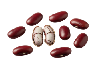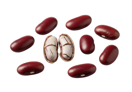 Photorealistic macro close-up of dry, deep red kidney beans scattered on a transparent background, one cracked open revealing its pale, starchy interior, precise study of natural textures