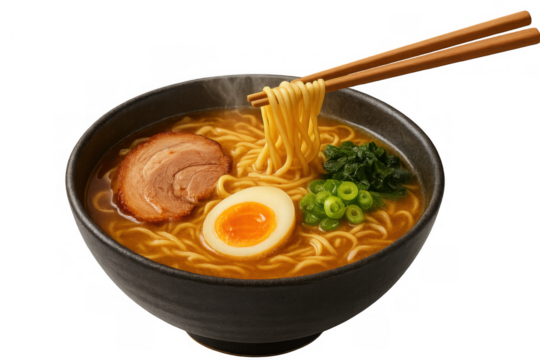 Ramen noodles being lifted from a steaming bowl with chopsticks, showing japanese chashu pork, egg, and green onions. Transparent background