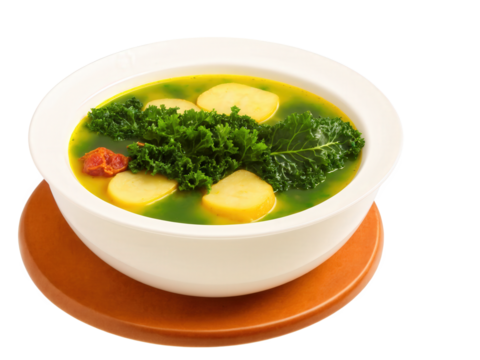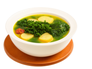 Portuguese caldo verde with green kale, potatoes, and chorizo slices, vibrant colors.