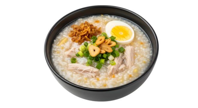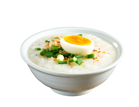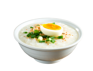 Delicious filipino arroz caldo rice porridge with egg and green onions isolated on transparent background