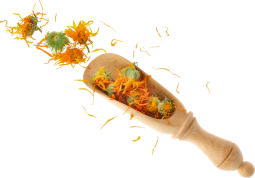 Wooden scoop of dried calendula flowers, isolated on white background. Petals of calendula flowers for making healthy herbal tea. Top view.
