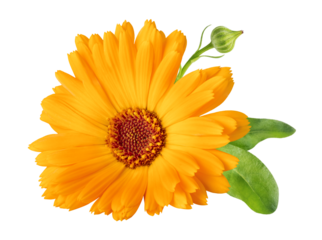 Calendula officinalis flower isolated on white or transparent background. Marigold medicinal plant, healing herb. One single calendula flower.