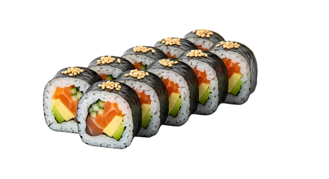 Sushi roll california maki with salmon avocado and cucumber isolated on black background close up shot view transparent background
