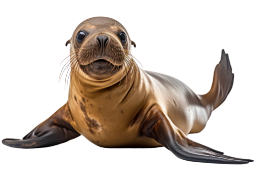 A sea lion sitting upright with its head raised high and whiskers prominent isolated on white background