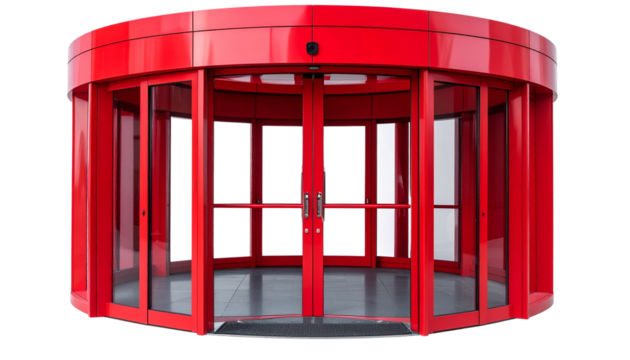 Stylish red revolving door with modern design isolated on solid white background in Png format