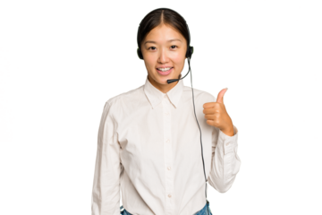 Telemarketer asian woman working with a headset isolated on green chroma background smiling and raising thumb up