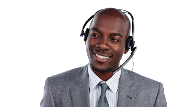 Call center, man and smile for thinking, customer service and CRM questions isolated on transparent png background. African salesman, IT consultant and microphone for telecom help, contact and advice