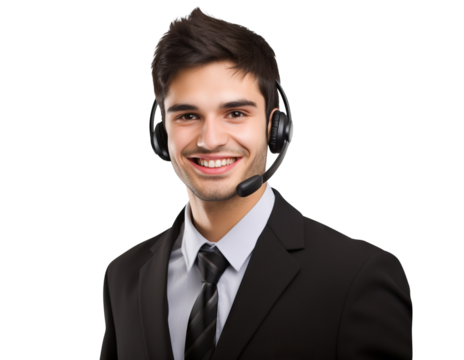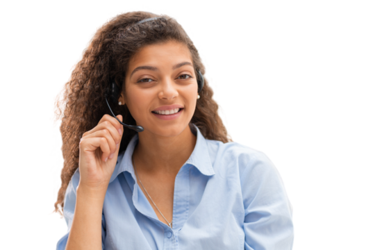 Call center, customer service and portrait of a happy woman isolated on a transparent, png background. Crm, telemarketing and smiling female with a headset at help desk for support and advice