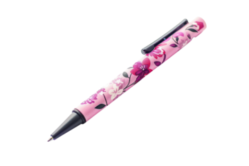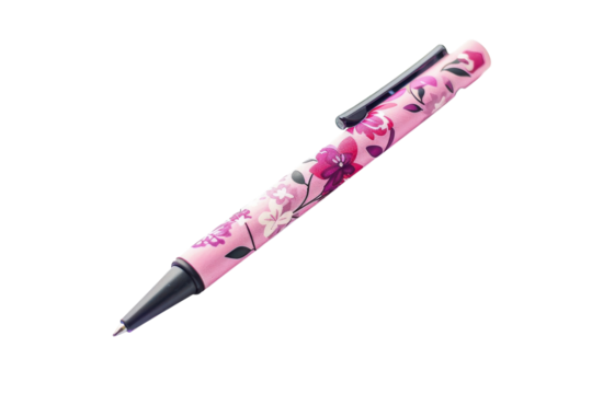 A charming pink floral pen resting on a clean white surface inviting creativity and inspiration in a tranquil setting isolated on transparent background