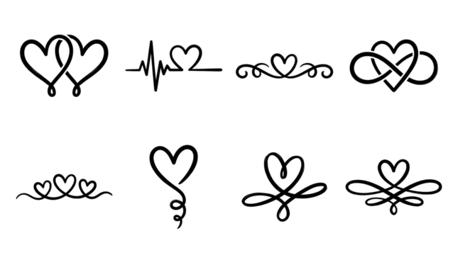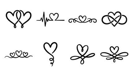 Minimalist black heart set including infinity, heartbeat, flourish, and filigree ornaments isolated. Romantic icon collection for wedding and love themes.