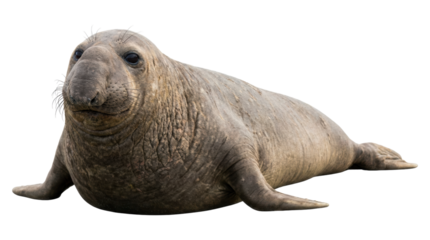 Large gray northern elephant seal with thick wrinkled skin and long whiskers is lying down and looking directly at the camera with its big, dark, expressive eyes in a full-body view