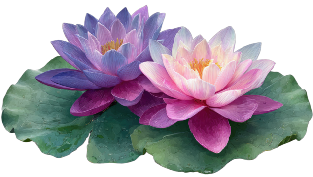 Two beautiful watercolor lotus flowers, one pink, one purple, on green leaves