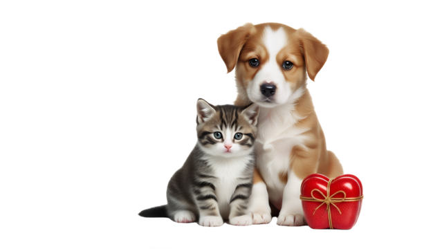 Adorable puppy and kitten with heart shaped gift on black background for Valentine's Day