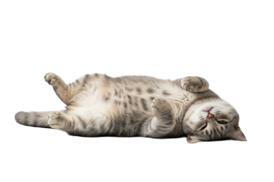 Adorable gray cat lying belly up with relaxed body language and soft fur, showing calm and peaceful mood in minimal isolated setting