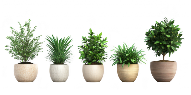A serene arrangement of five diverse potted plants in varying sizes and shapes. lush greenery against a clean white background. ideal for interior design inspiration