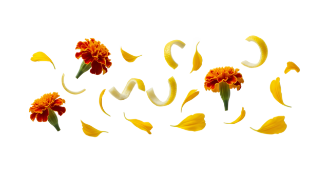 Vibrant marigold flowers and petals floating gently through the air in a serene environment viewed from directly above