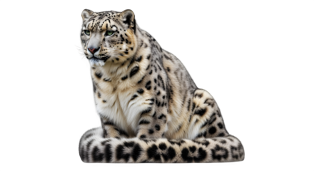 Snow leopard sitting calmly with detailed fur texture, isolated on white background