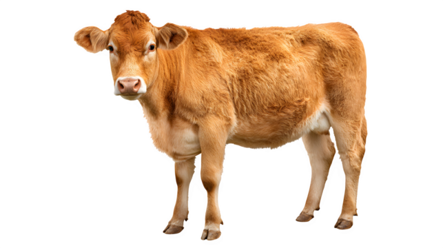 brown cow standing calmly, realistic farm animal portrait, isolated on white background